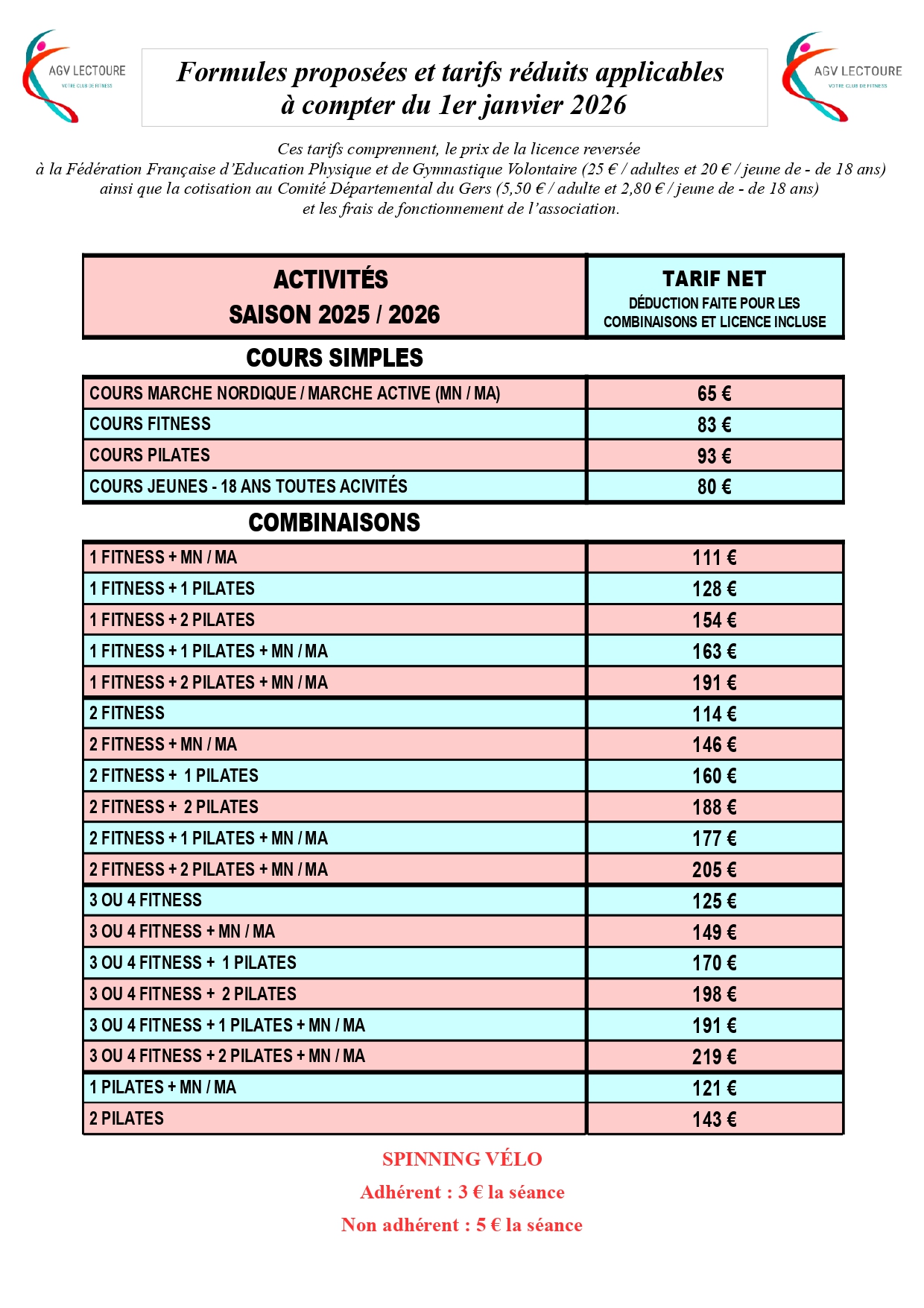 Ces tarifs comprennent, le prix de la licence reversée à la Fédération Française d'Éducation Physique & de Gymnastique Volontaire (FFEPGV) ainsi que la cotisation au Comité Départemental du Gers (CODEP 32) et les frais de fonctionnement de l'Association.